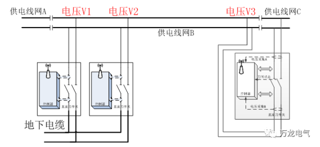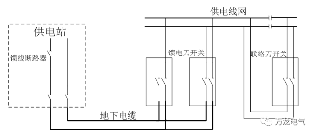 双源纯电动公交供电系统不仅要为车辆提供动力负荷和充电负荷,还要给车辆上装设的空调(暖气)、气泵等设备提供电能,在电车数量的持续增加下,供电系统的负荷压力大幅度上升,容易导致电站供电设备、地下电缆接头出现过热,绝缘老化等问题,在维修和保养时无法给线网提供电能。同时,城市中存在的地下施工作业也容易导致供电电缆被截断、损坏接地等问题,同样对车俩的正常供电早成不利影响。当出现上述问题时,需要断开馈电隔离开关,将对应线网和电缆进行隔离,然后使用相邻线网进行联络应急供电,保证该线网为车辆正常供电。