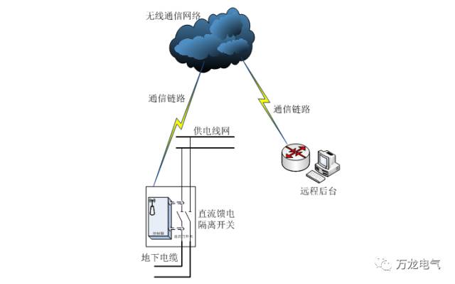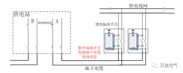 当这种隔离开关和供电站结合起来时,即可高效率地完成针对地下电缆的绝缘检测。通过后台系统闭合供电站内某条直流馈线的断路器,并断开其余直流馈线回路,然后将该直流馈线对应的隔离开关断开,再通过供电站内的绝缘检测设备即可评估该馈线电缆对地的绝缘泄漏情况,由于后台系统对隔离开关操作的高效性,可以定期对所有直流馈线电缆进行绝缘泄漏评估,并记录相关数据,通过对比了解馈线电缆对地泄漏的变化。